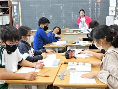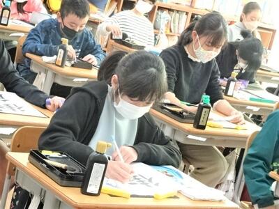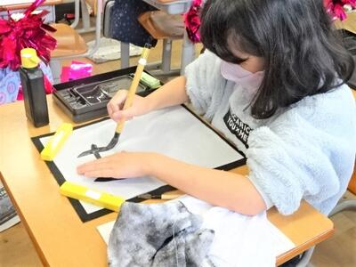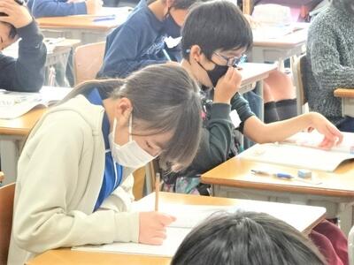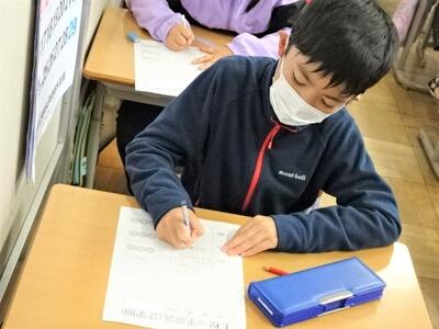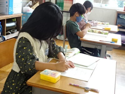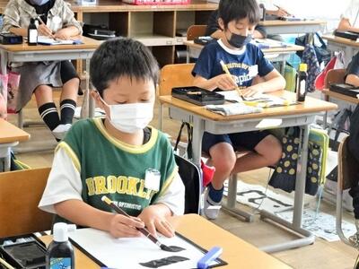 【4年生】1枚目の写真は、書写の時間の様子です。姿勢良く、筆をたてながらしっかりと書いている様子が印象的です。今日は、ひらがな「はす」に挑戦しました。ひらがなは、バランスをとったり、「結び」の部分を書いたりと、漢字よりも難しいものです。子どもたちは、集中して取り組んでいました。