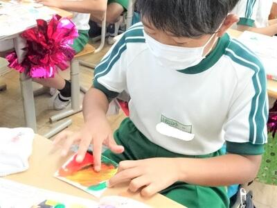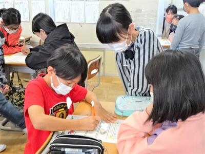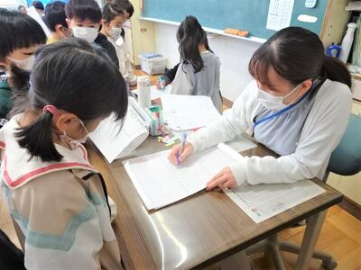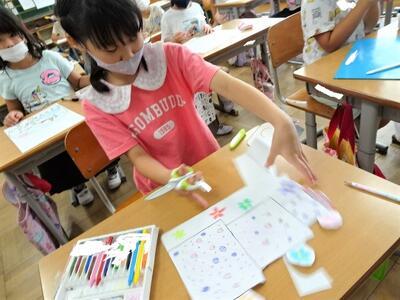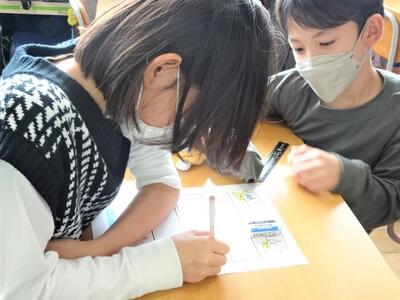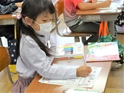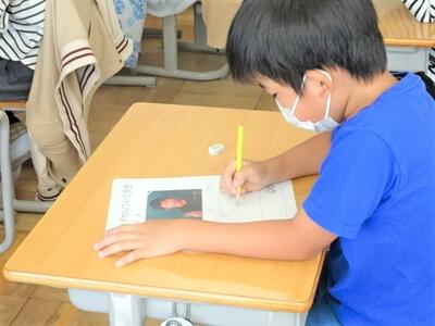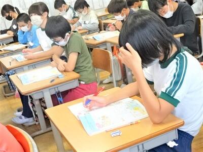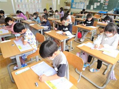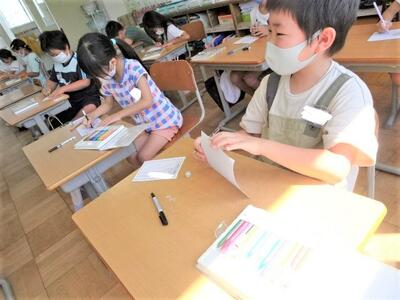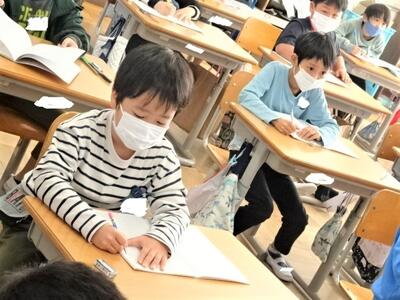 【2年生】1枚目の写真は、学級活動の時間に2学期の目標を考え、「かみまつっこせんげん」のカードに記入している様子です。学習面や生活面の視点ごとに目標を決めます。目標に向かって頑張る姿を応援したいと思います。