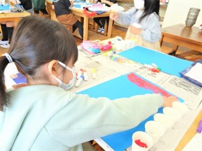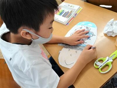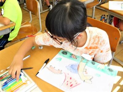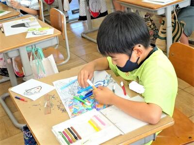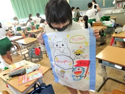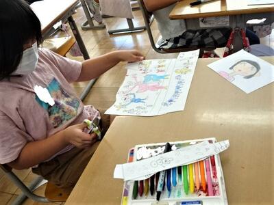 【4年生】1枚目と2枚目の写真は、運動会で自分たちが使用する用具を作っている様子です。どうやら4年生の障害走の時に使用するみたいです。一人一人に配布された袋に、自由に絵や文字を描いていきます。足も出せるようになっています。使い方は、運動会本番をお楽しみに!