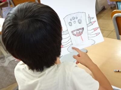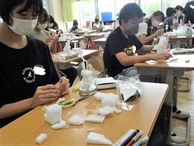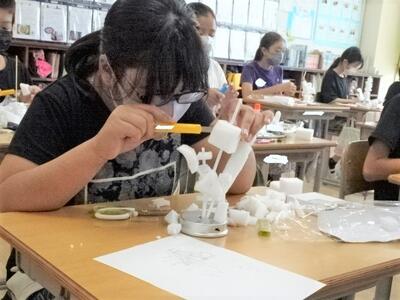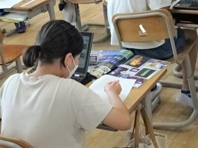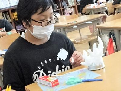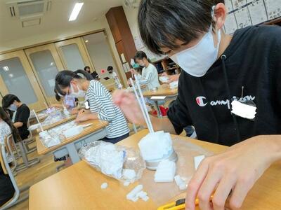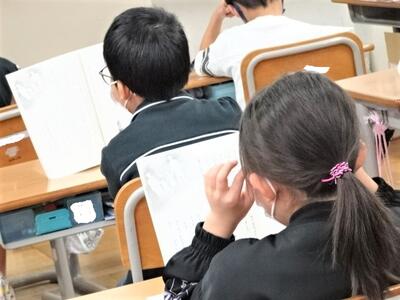 【6年生】6年生の図画工作も新しい単元に入りました。「いっしゅんの形から」という題材です。液体粘土で固めた布の形の美しさや面白さを感じ取って、造形的な活動を行います。今日は、早速完成予想図を描いていました。