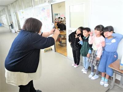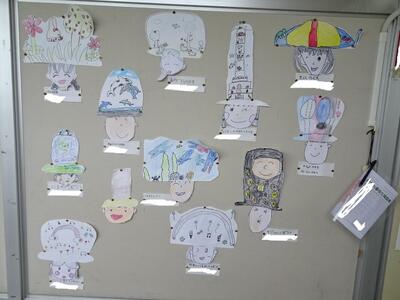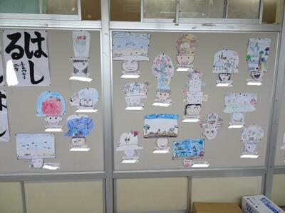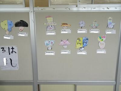 【1年生】1枚目の写真は、国語の「くじらぐも」の音読発表会の様子です。ちょうど「てんまでとどけ!1・2・3!」と、子どもたちがくじらぐもに向かってジャンプする場面です。しっかりくじらぐもに乗ることができたようです。