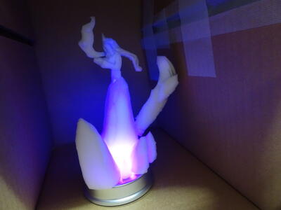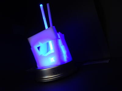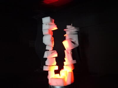 メラニンスポンジが赤や青の光を放っています。真っ暗の箱の中で光を放つ作品です。仕上がるまでには、たくさんの苦労がありました。細かく細工したり、仕上がりを想像して組み立てたりしてきました。