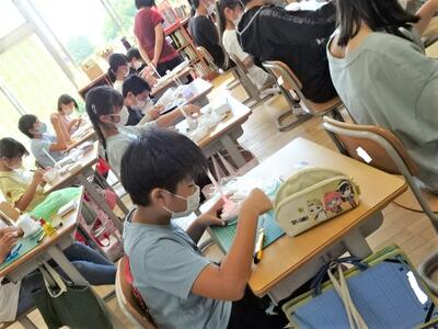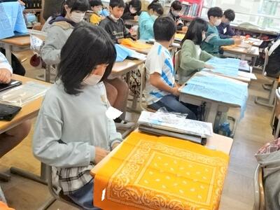 【5年生】5年生も運動会の表現運動の練習がありましたが、私が取材できませんでした。1枚目の写真は、家庭科の時間の様子です。これまで、いろいろな手縫いの練習を行ってきた5年生です。いよいよ小物作りに挑戦します。今回は「小物入れ」になります。早速ボタン付けから初めていました。