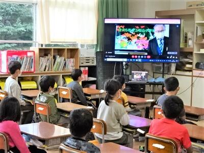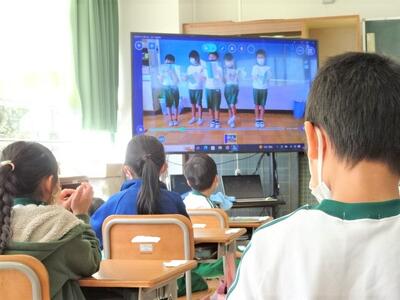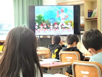 【1年生】1枚目の写真は、国語の「くじらぐも」の音読発表会の様子を視聴している場面です。各グループが工夫をして、元気の良い台詞を言いながら、楽しく発表をすることができました。どのグループも上手です。