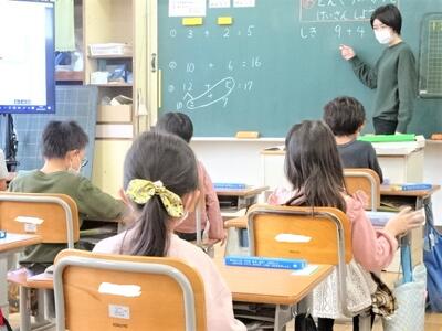 【1年生】1枚目と2枚目の写真は、算数に時間の一場面です。「たしざん」の単元です。1年生の学習も、いよいよ繰り上がりのあるたしざんに突入しました。これまで学習してきたことを活かしながら、さくらんぼ計算の方法を学んでいます。