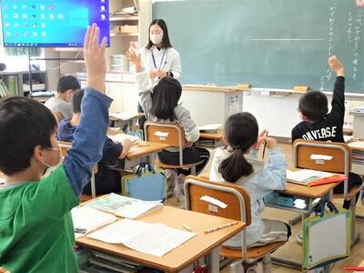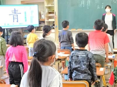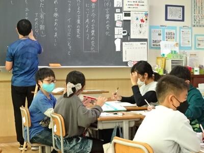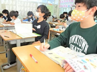 【3年生】1枚目の写真は、国語の時間の様子です。「ちいちゃんのかげおくり」の学習で、5の場面の主人公の気持ちについて話し合っている場面です。2枚目の写真は、漢字の学習です。字を書く際の留意事項を確認して、手で空書きして練習しています。