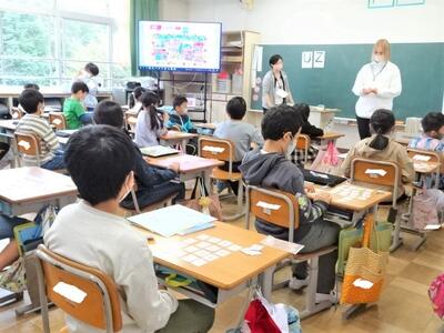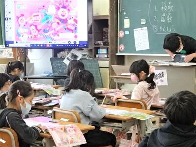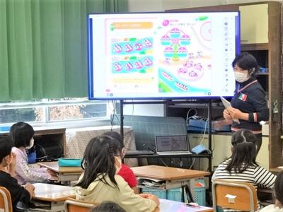 【2年生】2階から歓声が聞こえます。教室をのぞいてみると、外国語活動の時間でした。動物のカードを使ってビンゴゲームをしている場面でした。パソコン上で自分のビンゴカードを作り、ビンゴを行っていきました。5ビンゴになった子どもたちもいて、盛り上がっていました。