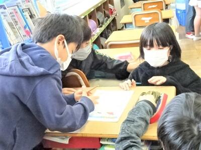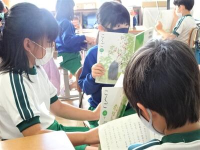 【2年生】1枚目の写真は、図書室で本を選んだり、読書をしたりしている場面です。子どもたちは、選んだ本を先生に紹介したくてしょうがありません。また2枚目の写真は、隙間の時間に読書をしている様子です。よい習慣が身に付いています。