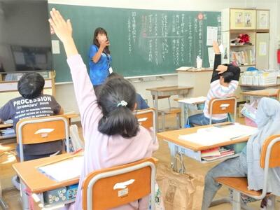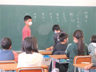 【2年生】1枚目の写真は、国語に時間の様子です。「ことばあそびをしよう」という単元で、一人一人が考えた「あいうえお」などを先頭にした言葉を発表しているのです。楽しい言葉を発表して、すごく盛り上がっていました。