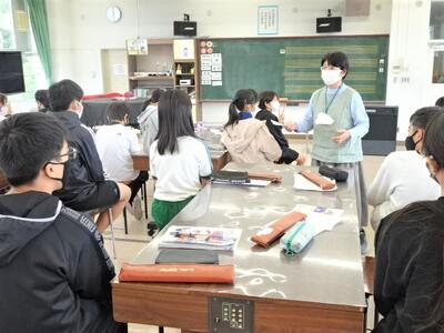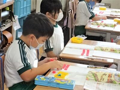 【5年生】1枚目の写真は、家庭科の「ひと針に心をこめて」という単元の学習の一場面です。針と糸を使って玉どめや玉結、ボタンぬいなどの練習をしてきました。今は最後の小物の作りの作業を行っています。ボタンをしっかりと付けたり、袋状に縫ったりして、自分の小物入れを作成していました。
