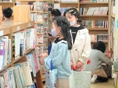 【1年生】1枚目の写真は、図書室で借りる本を選んでいる様子です。明日からの5日間の秋休みに備えて、図書室で本を借りました。図書室にはいろいろな本がたくさんあり、どの本にするかを迷いながら、真剣に選んでいました。本好きな子どもたちです。