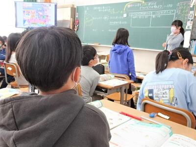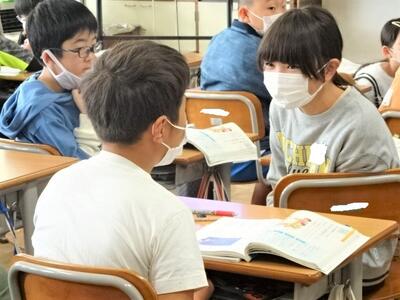 【4年生】1枚目の写真は、音楽の時間の写真です。「曲に合った歌い方」という題材の学習で、「とんび」の歌詞とその歌い方について話し合っています。グループで話し合ったり、意見を発表し合ったりして、「とんび」に合う歌い方で歌うことができました。