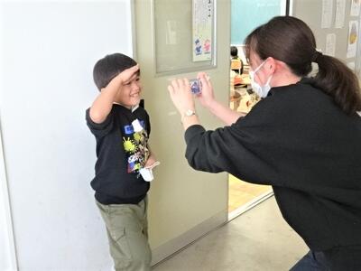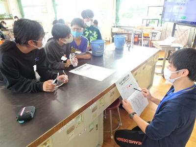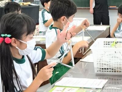 【4年生】1枚目の写真は、理科の時間の一場面です。「とじこめた空気や水」という単元です。注射器の実験器具を使いながら、空気を圧して、体積が縮こまることや、この原理を使って空気でっぽうでスポンジを飛ばすことができることを実験していました。