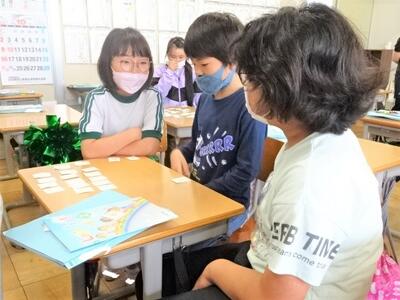【3年生】1枚目と2枚目の写真は、外国語活動の様子です。アルファベットの大文字に親しもうというめあての活動です。1枚目は、教科書の付録に付いている大文字のアルファベットカードを切り取っている様子です。2枚目は、切り取ったカードを使って神経衰弱のゲームを行っている様子です。子どもたちは、ゲームに夢中です。