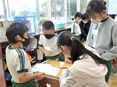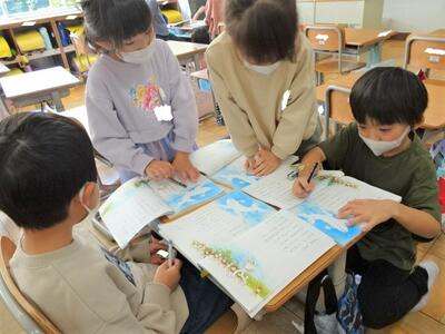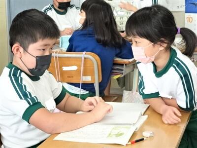【2年生】1枚目の写真は、国語の時間に「お手紙」のグループ音読をしている様子です。ナレーター、がまくん、かえるくんの役割分担をして読み合っています。この時間の最後には、クラス全体で読んでいくことができました。