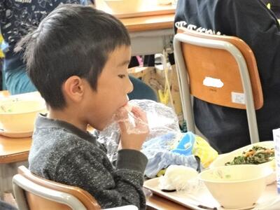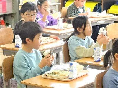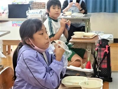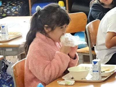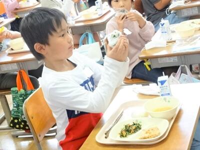 今日は「おにぎりの日」です。1枚目の写真のように、おかずはありますが主食となるご飯やパンがありません。子どもたちは、自分でにぎったり、お家の方ににぎってもらったりしたおにぎりを、おいしそうに頬張っていました。保護者の皆様、ご協力をいただきありがとうございました。