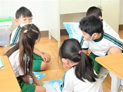 【3年生】1枚目の写真は、理科の時間の一場面です。2学期に入り、新しい単元「かげと太陽」の学習に入りました。天気がよければ、外で影つなぎや影踏みをしてから、気付いたことや疑問に思ったことを話し合いますが、今日はこれまでの経験をもとにしながら話し合いを進めていました。