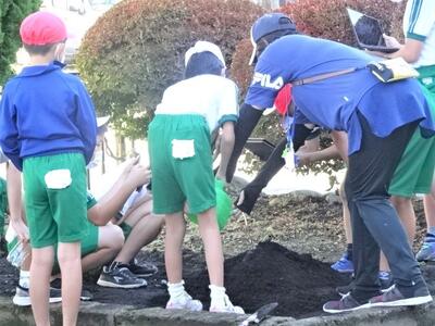【5年生】1枚目の写真は、理科の実験を行っている様子です。「流れる水のはたらき」の学習です。校舎北側の花壇を使って、山を作った上で川を作り、そこに水を流してみるのです。水がどんな作用をするかを観察していました。