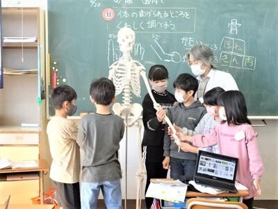 【4年生】4年生の理科が新しい単元に入りました。「ヒトの体のつくりと運動」という単元の学習です。今日は、一枚目の写真にあるように、骨の仕組みについて調べていました。特に関節の部分をじっくりと見ていました。