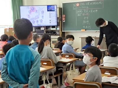 【6年生】1枚目の写真は、理科「月と太陽」の学習の様子です。月の軌道は、授業中に実際に見ることは難しいもので、パソコンや大型提示装置のおかげで、確認することができます。2枚目の写真でも、社会科の書院造りの様子を大型提示装置で確認しています。大型提示装置も、子どもたちの学力を支える優秀なツールです。