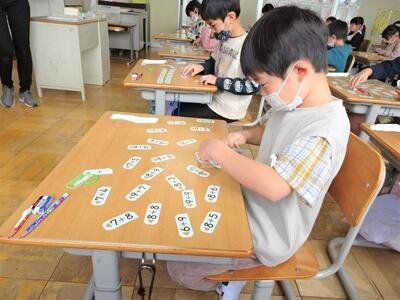 【1年生】1枚目と2枚目の写真は、算数の「たしざん」の学習の様子です。「かあど れんしゅう」をすることが目的です。計算カードを並べたり、答えが同じになるカードを探したりと、カードを使った学習に親しみました。