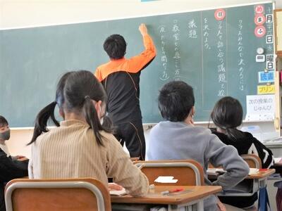 【6年生】1枚目の写真は、国語の時間の一コマです。宮沢賢治の「やまなし」の学習をしています。黒板に表が書いてありますが、5月と12月の様子を比べながら、物語を読み解いてきました。イーハトーブの世界観に浸っていました。