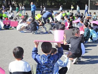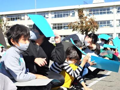 10月26日(水)に、130周年記念事業の一環として航空写真撮影を行いました。航空写真といっても、今はセスナ機ではなく、ドローンでの撮影です。校庭に描かれた白線の上に、緑色や黄緑色などの色画用紙を持って写真撮影に臨みました。校庭に「まっぽん」が描かれました。航空写真の後は、学年ごとに集合写真を撮りました。