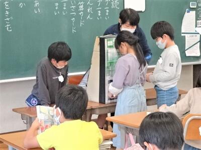 【2年生】1枚目と2枚目の写真は、生活科の時間の一コマです。「行ってみよう つかってみよう」という題材の学習で、電車に乗る体験活動を予定しています、今日は段ボールで作られた切符販売機を活用して、お金を入れたり、切符を取り出したりする練習を行いました。
