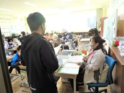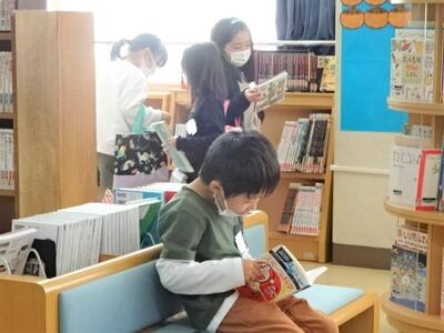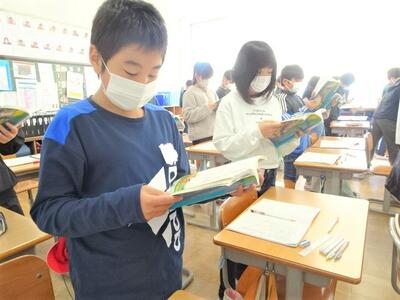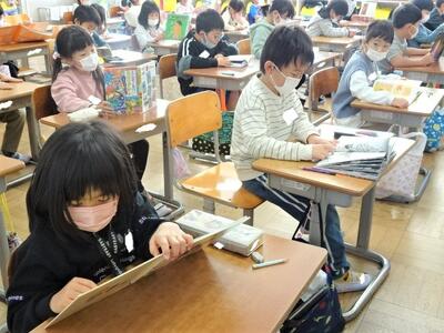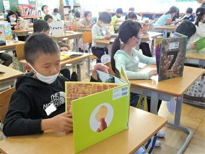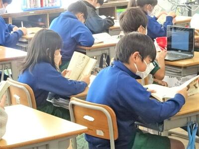 【2年生】1枚目の写真は、図書室で本を選んだり、読書をしたりしている場面です。子どもたちは、選んだ本を先生に紹介したくてしょうがありません。また2枚目の写真は、隙間の時間に読書をしている様子です。よい習慣が身に付いています。