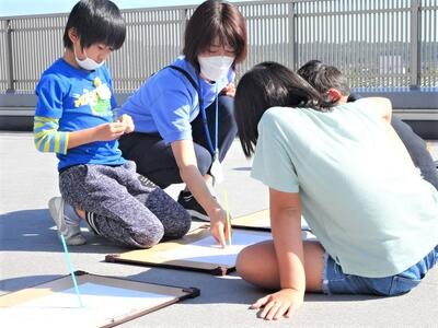 【3年生】1枚目の写真は、理科の時間に観察をしている様子です。「かげと太陽」の学習で、太陽とかげの関係を定点で調べていく活動をしています。太陽の向きとかげの向きや長さ、観点を設定して観察しています。