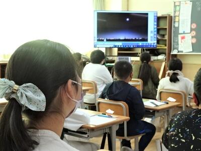 【6年生】1枚目の写真は、理科「月と太陽」の学習の様子です。月の軌道は、授業中に実際に見ることは難しいもので、パソコンや大型提示装置のおかげで、確認することができます。2枚目の写真でも、社会科の書院造りの様子を大型提示装置で確認しています。大型提示装置も、子どもたちの学力を支える優秀なツールです。