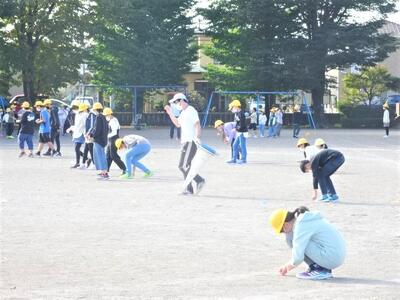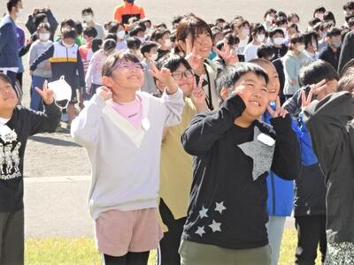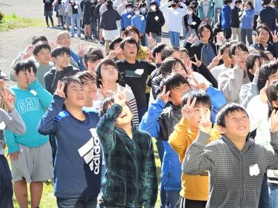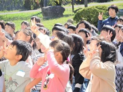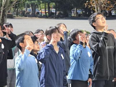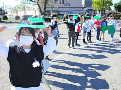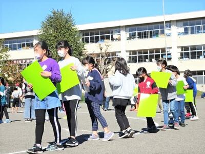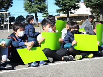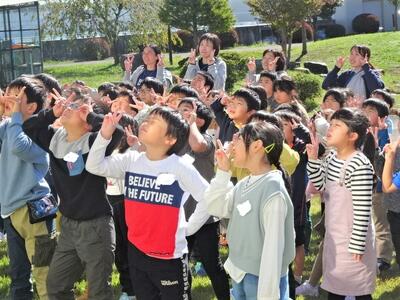 10月26日(水)に、130周年記念事業の一環として航空写真撮影を行いました。航空写真といっても、今はセスナ機ではなく、ドローンでの撮影です。校庭に描かれた白線の上に、緑色や黄緑色などの色画用紙を持って写真撮影に臨みました。校庭に「まっぽん」が描かれました。航空写真の後は、学年ごとに集合写真を撮りました。