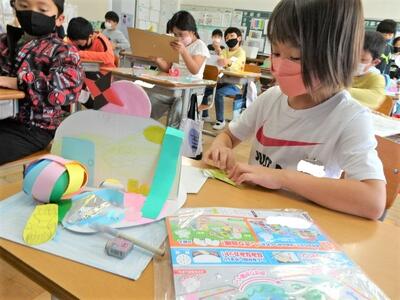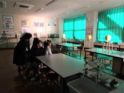 【6年生】1枚目の写真は、理科の「月と太陽」の学習の一コマです。月の形の見え方と太陽の関係について学習しています。27日には理科室全体を使って、ボールを月に見立てて、懐中電灯(太陽)を光を当てて、太陽の光と月の見え方の実験をしました。今日は、手元で見られる模型を使って、見え方の整理をしていました。