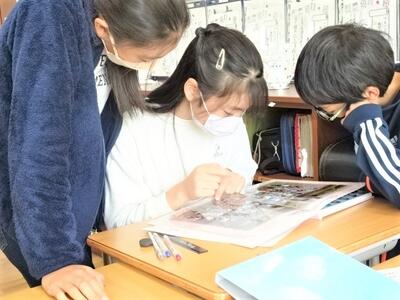【6年生】1枚目の写真は、卒業アルバムの作成について、これまでのアルバムを見ながらイメージを高めている様子です。もうすぐ、アルバムのための写真撮影が始まります。どんなところでクラス写真を撮って、どんな文集を作っていくのか話し合っていました。