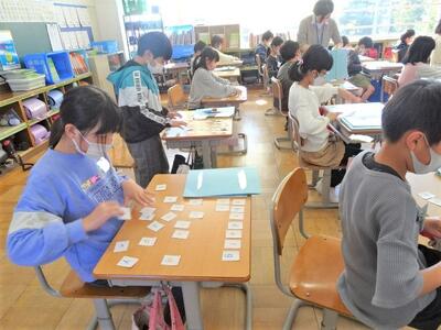 【1年生】1枚目と2枚目の写真は、算数の「たしざん」の学習の様子です。「かあど れんしゅう」をすることが目的です。計算カードを並べたり、答えが同じになるカードを探したりと、カードを使った学習に親しみました。