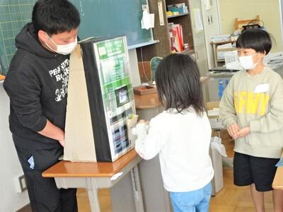 【2年生】1枚目と2枚目の写真は、生活科の時間の一コマです。「行ってみよう つかってみよう」という題材の学習で、電車に乗る体験活動を予定しています、今日は段ボールで作られた切符販売機を活用して、お金を入れたり、切符を取り出したりする練習を行いました。