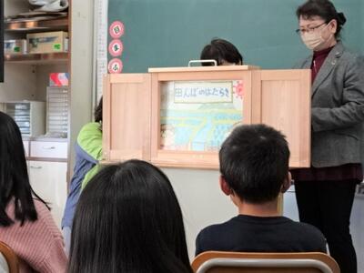 16日(水)に、塩谷南那須地区農業士会に所属されている女性農業士4名に来てただき、農業に関する話を聞きました。「田んぼのはたらき」と「いちごのはなし」という紙芝居を中心に説明をいただき、子どもたちの質問にも答えていただきました。