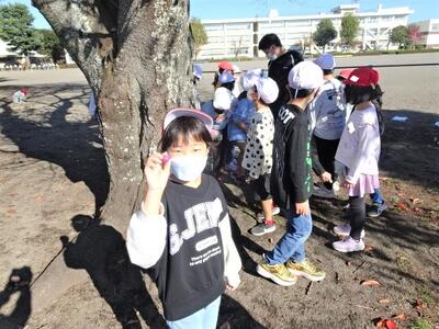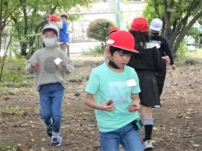 【2年生】1枚目の写真は、学校の校庭を巡りながら、「あき」を感じられるものを見つける活動をしています。まつぼっくりやどんぐり、紅葉した葉っぱなど、いろいろな「あき」を見つけていました。子どもたちは、いろいろなものの発見のスペシャリストです。