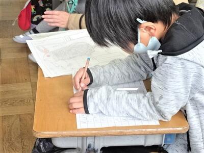 【3年生】3年生の教室をのぞいたら、子どもたちが熱心に何かの設計図を書いています。聞いてみると図画工作の「くぎうちトントン」という題材の学習です。名前の通り、実際の活動では金づちを使って、板に釘を打って、いろいろな形を作っていく活動をします。今日は、どんなふうに釘を打つか、真剣に考えていました。
