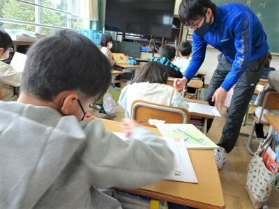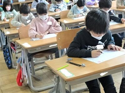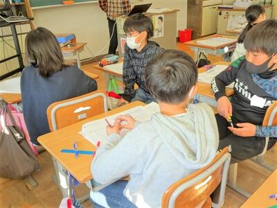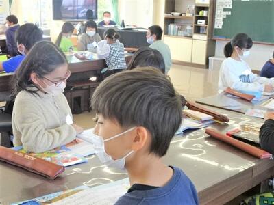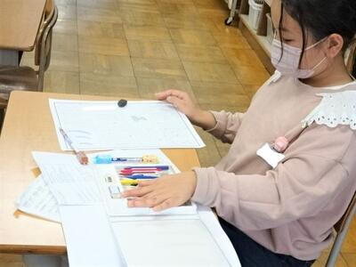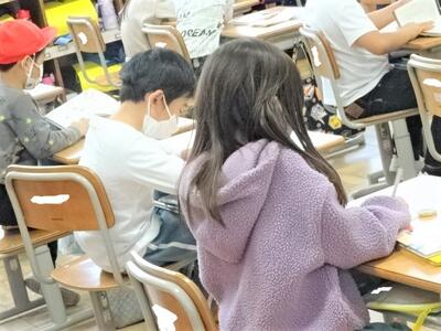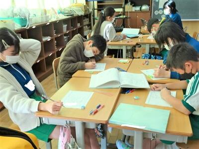 【4年生】1枚目の写真は、今度行われる「ありがとう集会」で渡す感謝の手紙を書いている場面です。今回は、学校支援ボランティアの皆様や交通指導員さん、パトロール隊の皆様など、地域の方々へのお手紙になります。一枚一枚、心を込めて丁寧に書いていました。