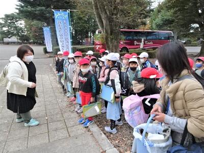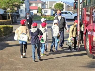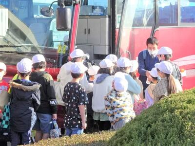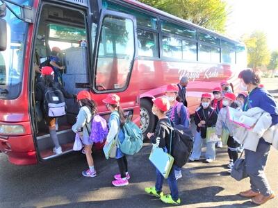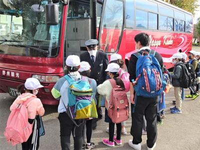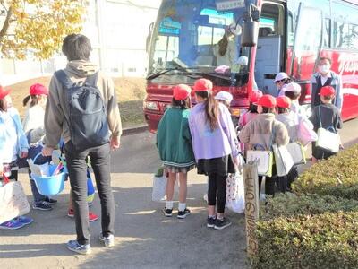 【4年生】社会科の学習の一環で、「益子」に校外学習に出かけました。今日は、窯元のところに行って、益子焼ができるまでの様子を見学したり、実際に「絵付け」を行ったりしました。写真は、出発の時の様子です。