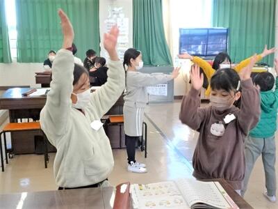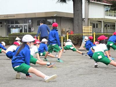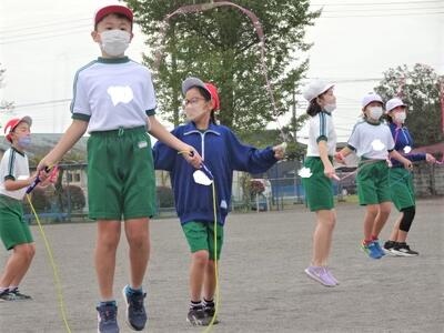 【4年生】1枚目の写真は、体育の時間の様子です。「多様な動きをつくる運動」という単元の学習で、縄跳びや4分間走などを行います。体のバランスをとる動きや、体を移動する動き、力試しの動きなどを身につけることを目標にしています。本校では、持久走記録会も行っていますから、自分の目標を決めながら、それに向かって頑張ってほしいと思います。