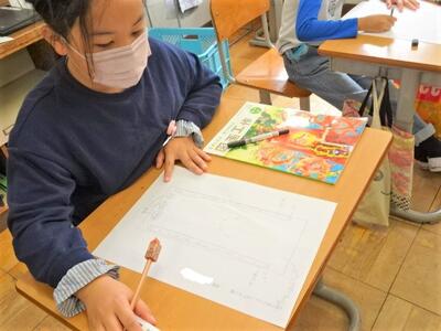 【3年生】1枚目の写真は、先日も他のクラスの紹介をさせていただきましたが、「くぎうちトントン」の土台の絵を描いている場面です。子どもたちは、細長い板に思い思いの絵を描いていきます。ほぼ土台が完成してきたようです。いよいよ釘打ちが近づいてきました。