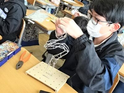 【5年生】1枚目の写真は、図画工作の「立ち上がれ!ワイヤーアート」の学習の様子です。針金を曲げたり立たせたりして作品を作っていく活動です。針金だけで立体的な作品を作ります。子どもたちは、ペンチなどを器用に扱いながら、自分が思い描いた形になるよう真剣に取り組んでいました。