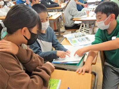 【3年生】1枚目の写真は、国語の時間の一コマです。「はんで意見をまとめよう」という単元の学習で、1年生が本を好きになってくれるような読み聞かせを行うために、グループで1冊の本を選ぶのです。子どもたちは、いろいろ話し合いながら、これなら喜ぶと思われる本を一生懸命に探していました。