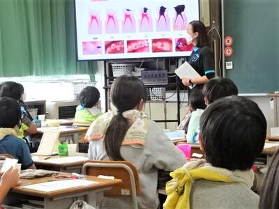 【6年生】1枚目と2枚目の写真は、歯科保健指導の様子です。歯科の専門家の皆様にお越しいただき、5年生と6年生への指導をしていただきました。6年生の学習では、これまで積み重ねてきた知識を総復習し、永久歯を虫歯にしないよう、歯の磨き方の再確認を行いました。「8020運動」80歳までに20本の自分の歯を残すことができるよう、しっかり歯磨きをしてくれることでしょう。