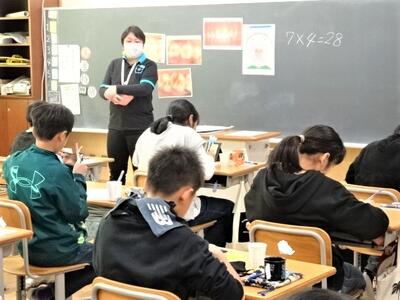 【4年生】1枚目の写真は、図工の時間の一コマです。絵の具を混ぜ合わせて色を作り出し、小さな上にデザインをしています。子どもたちは、いろいろなきれいな色を作り出して、自分の指で思い思いに描いていきます。同系色でまとめたり、原色を大胆に使ったりと、たくさんの芸術家が誕生しました。