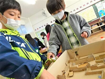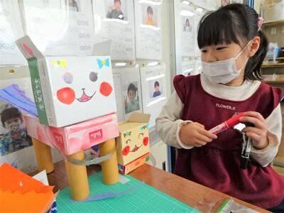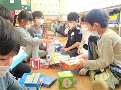 【1年生】1枚目の写真は、図画工作の時間の様子です。「いっぱい つかって なにしよう」という題材の学習で、箱を並べたりつないだりして、思いついたものを作っていくという内容です。いろいろな箱を組み合わせて、思い思いの作品を作ることができました。