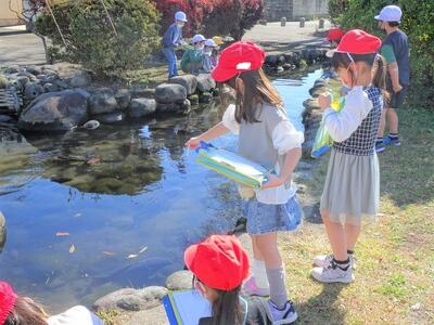 【4年生】1枚目の写真は、理科の時間の一場面です。「秋の生き物」という単元の学習で、まさに生き物探しをしているのです。子どもたちが手にしているのは、タイコウチとザリガニです。百年堀の水路で見つけました。トンボを見つけて観察しているグループもありました。