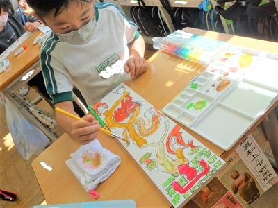 【5年生】1枚目の写真は、図画工作の時間の一コマです。「まだ見ぬ世界」という題材の活動で、写真から想像を広げて、まだ見たことも無い世界の様子を想像して、画用紙に工夫して表していくのです。子どもたちは、世界の絶景と言われる風景を選び、その続きを想像しながら表現していました。